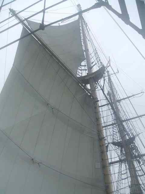 それとマスト登りに全員参加できたおかげか、タイザガスケットをやらせてもらえる事に。マストに登って閉じたセイルを畳む作業です。